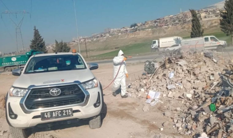 Kahramanmaraş Büyükşehir Belediyesi, deprem sonrası meydana gelebilecek salgın hastalıkların önüne geçmek için enkaz alanlarında ilaçlama çalışmalarını sürdürüyor.